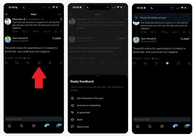人工知能によるスパムがX上のエンゲージメントに影響を与えていることへの対処として、低評価機能の再導入を試験的に開始しました。本機能導入の目的は、アルゴリズム強化とスパムアカウントの特定の簡素化です。AIによる本機能の利用を避けるため、現在はXプレミアムの会員のみの開放であり、Xユーザー全体の約1%しか利用することができません。